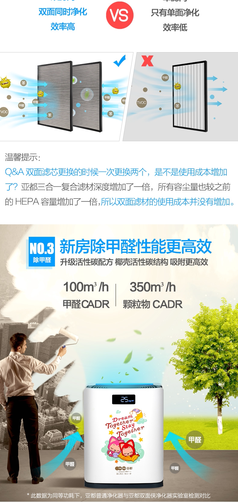 • 甲醛CADR值:100立方米/小时