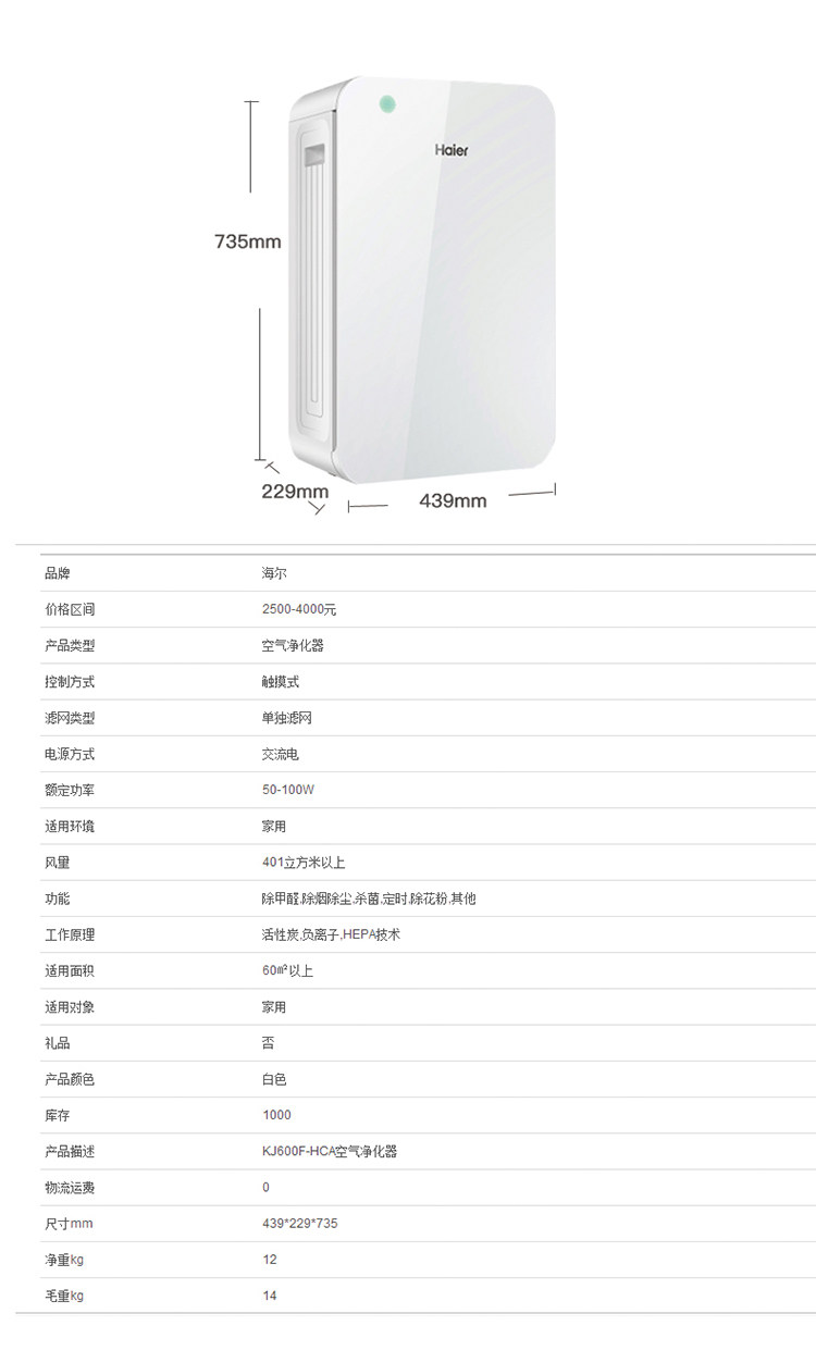 [海尔空气净化官方店空气净化,氧吧]Haier/海尔KJ600F-HCA月销量0件仅售3899元