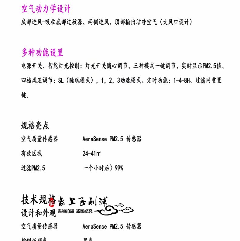 • 功能:定时 除VOC 除花粉 除颗粒物 除甲醛 除烟除尘 杀菌 除雾霾 除菌