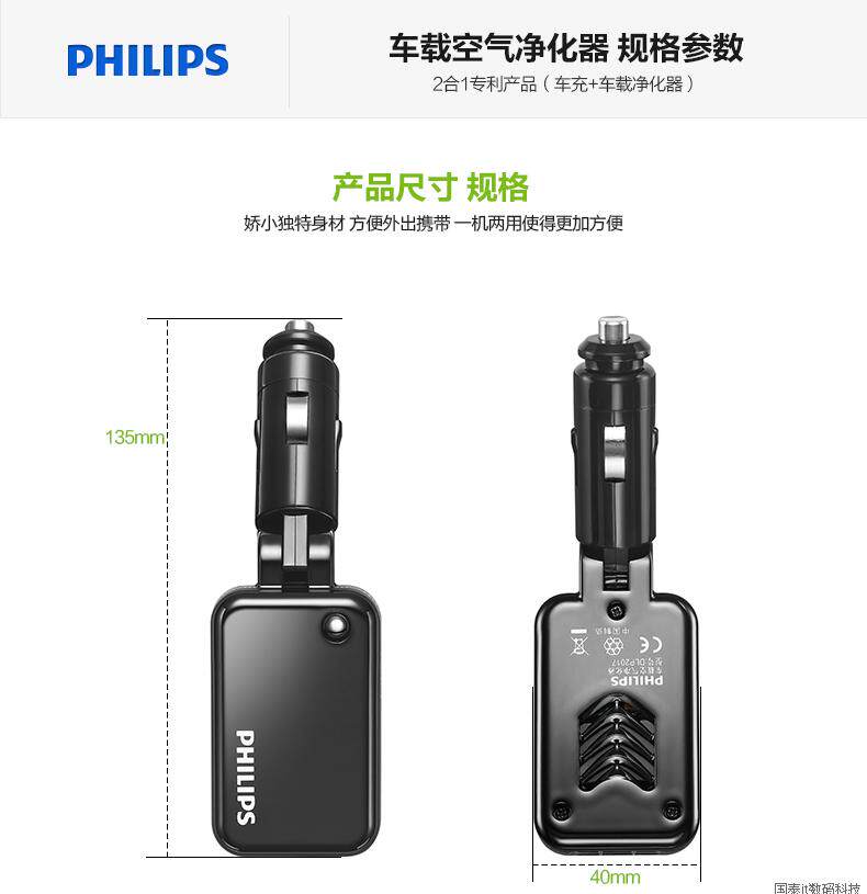 飞利浦DLP2017 车载氧吧负离子空气净化器车用净化手机车充电器