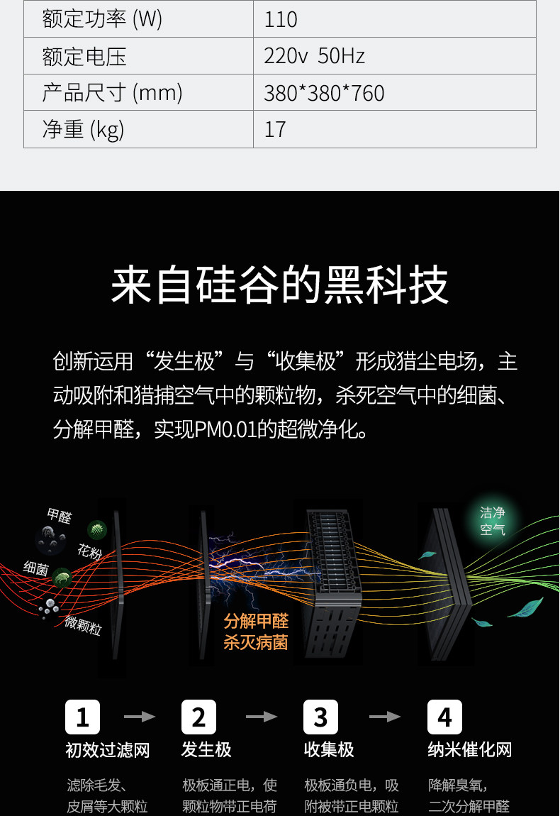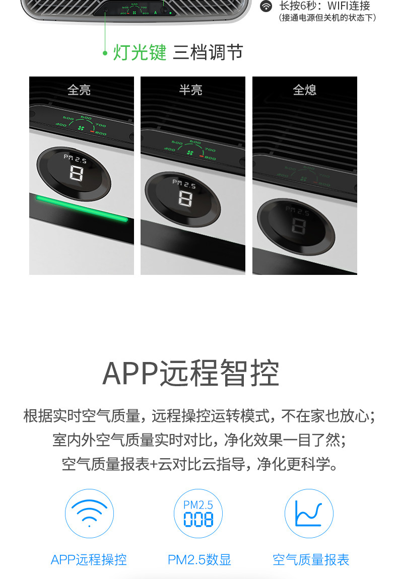 • 功能:除VOC 除花粉 除颗粒物 除甲醛 除烟除尘 杀菌 除雾霾 除菌, 负离子 除菌