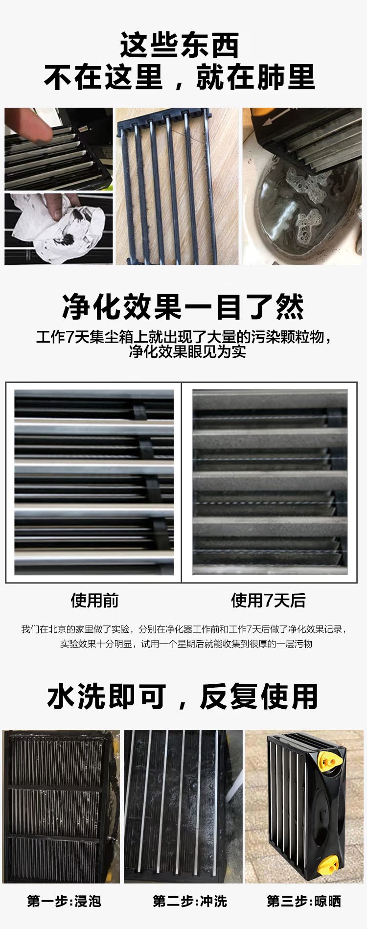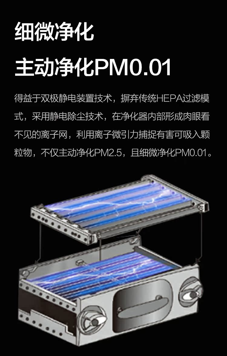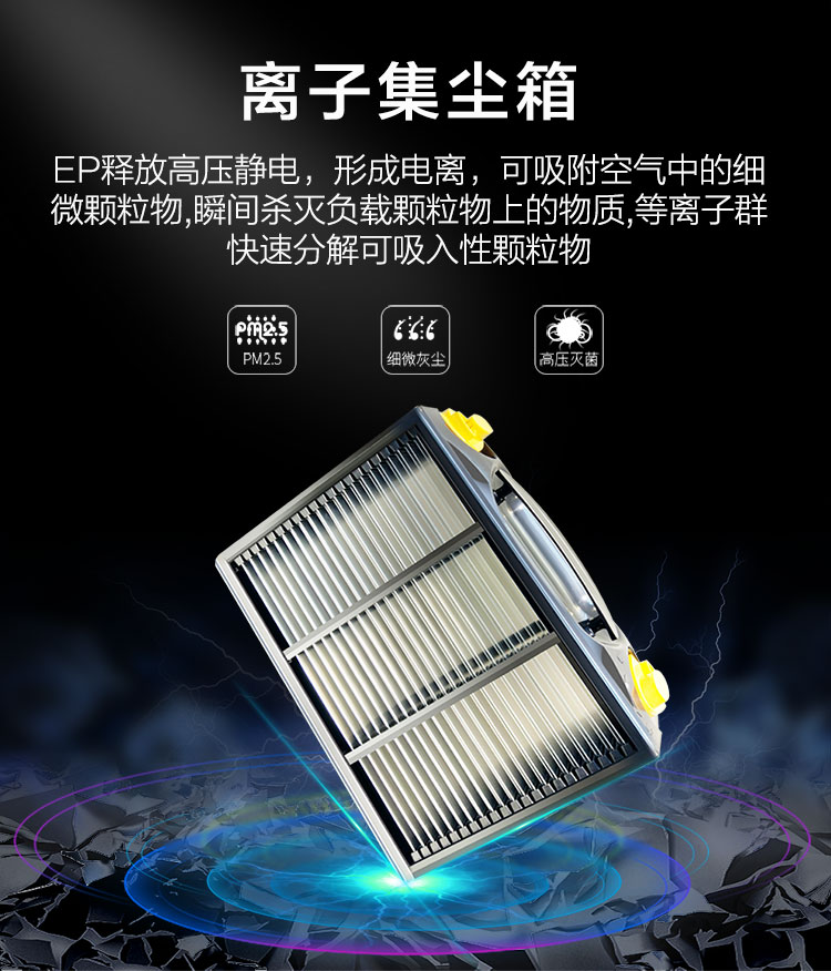 • 工作原理:静电技术 负离子 等离子 紫外线 光触媒