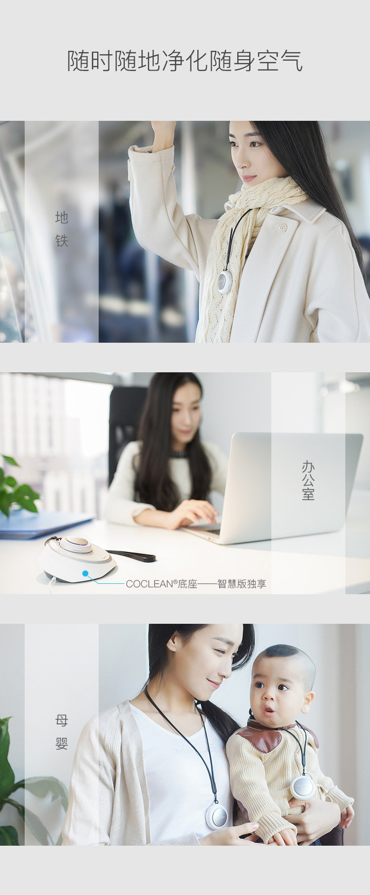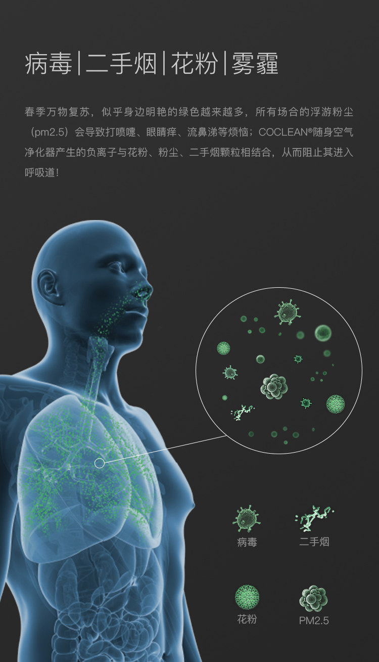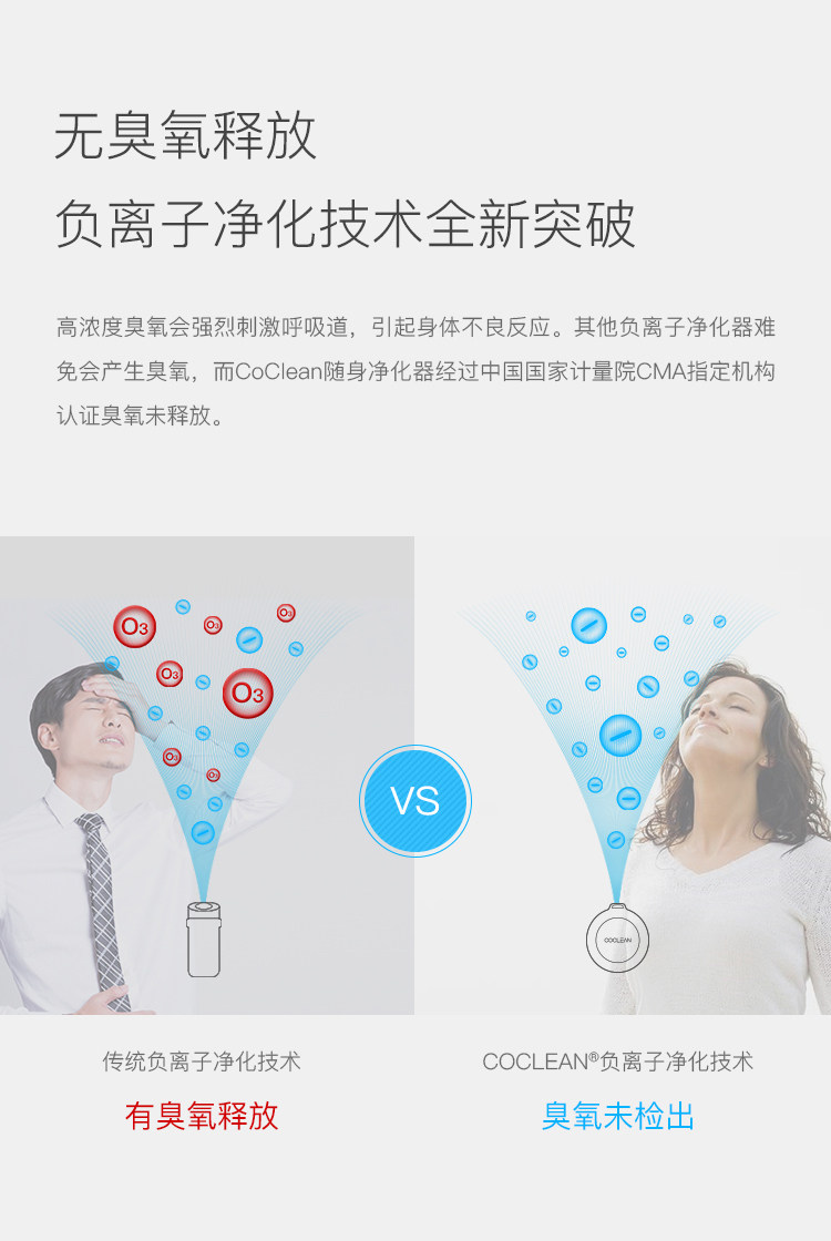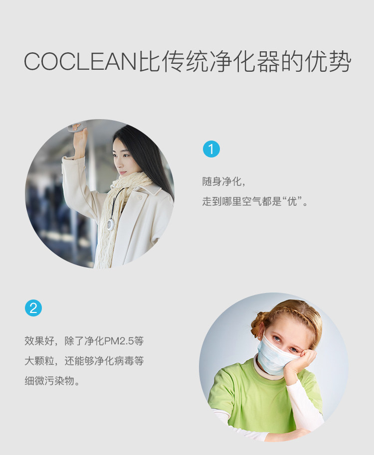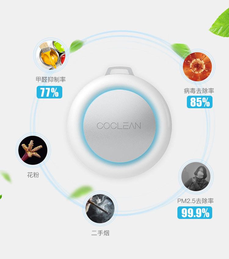 目前市面上的空气净化器净化器主要针对整体室内环境,有数据表明,空净仅仅有效处理周围几立方米的空气,远离空净的地方还是净化不了的,也就是说无法有效覆盖到你个人。而CoClean则不同,因为小巧可随身携带,能随时净化你身边的空气。