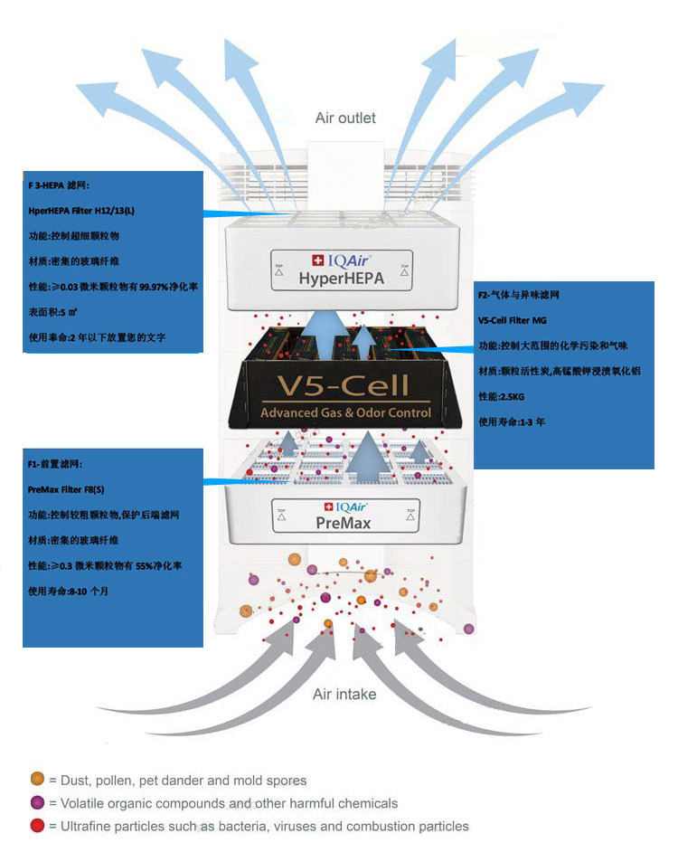 IQAir使用大表面积和高性能的滤芯, 可以延长滤芯的使用时间。假设在普通污染程度下,普通的风速(三档风速)下,滤芯每天运行24小时,不同的滤芯可以使用的时间为(以月来计算):