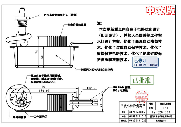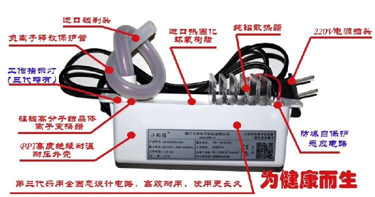 2-1、负离子采用了全固态设计电路,打破常规式电容线圈升压式电路,工作更持久,效果更佳,负离子活性更高,理论使用寿命为10年之久。