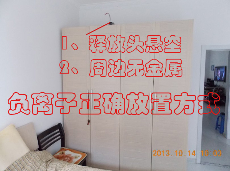 1-4、使用时不得将负离子和其他正在工作的电器共用一个排插,并保持0.5米以上距离,如果想要达到更好使用效果一般可以放置在卧室壁橱上,把发射头朝外,因位置比较高,负离子扩散效果更佳。