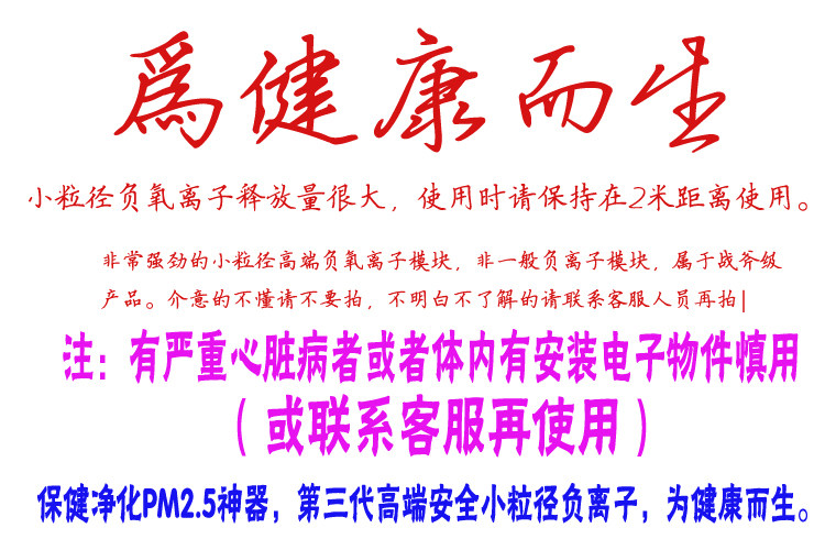1-3、因本款产品为最新款,尽管发热量很低,但是不能将负离子用布或者其他物体把其裹得严严实实的。通常情况下负离子长期开着就可以,如果人长期不在房间内,也可以将其关掉装在箱子里存放。