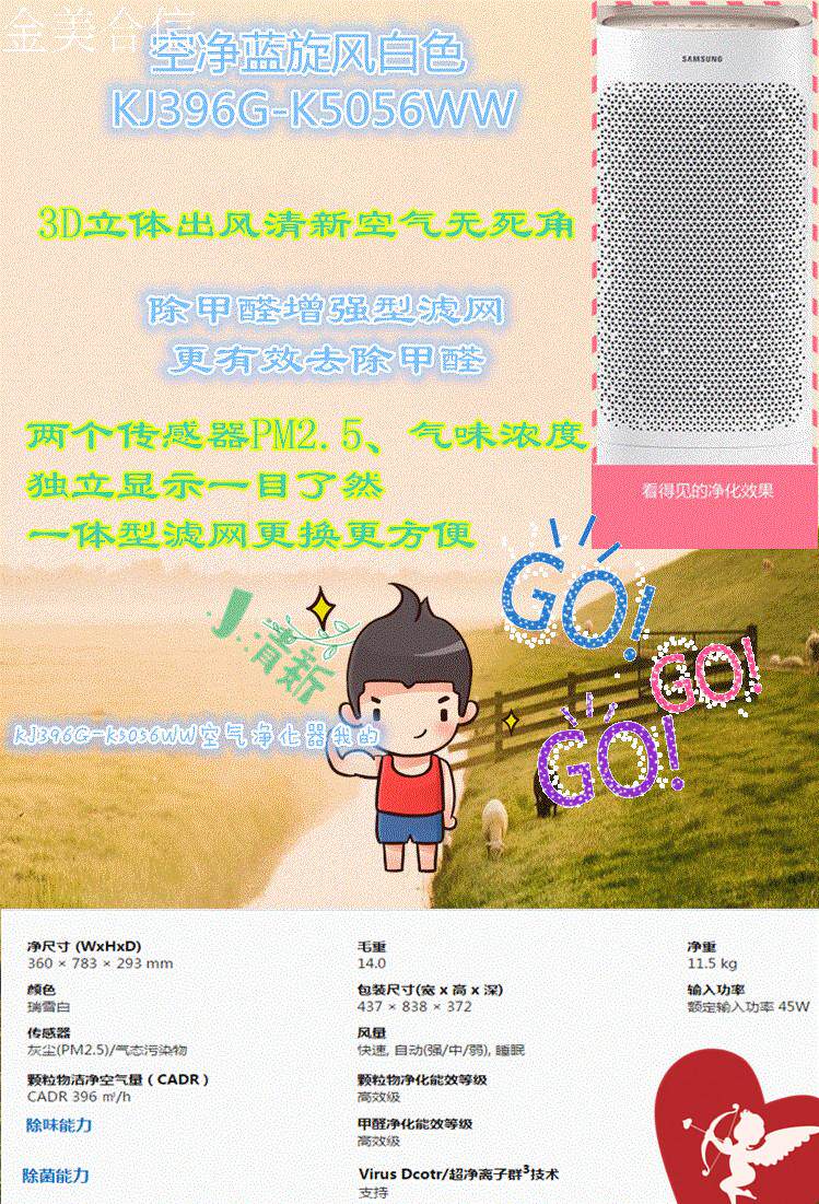 三星AX5500净化器KJ396G-K5056功能升级:超长效HEPA滤网延长使用时间2倍,HCHO强化滤网,过滤效果增强2倍; 滤网寿命提示,2个独立传感器,PM2.5/PM10/气味浓度独立显示,多种模式。适用儿童房、卧室、客厅;原装正品。除甲醛增强型。无静电除尘装置和无WIFI;全国联保。高于国家GB/T 18801-2015《空气净化器》标准
