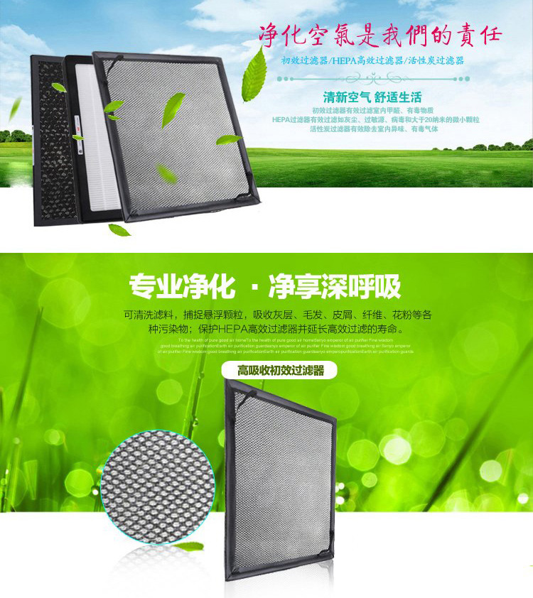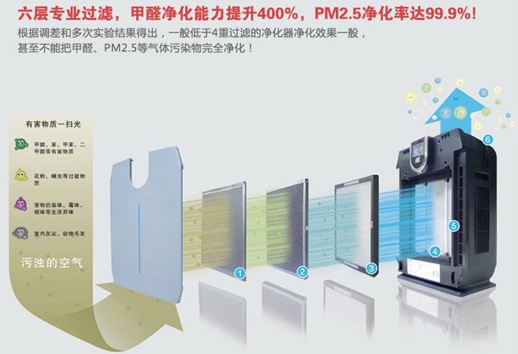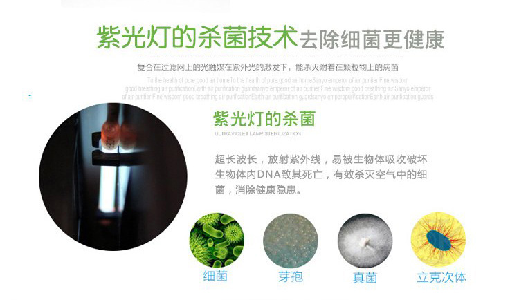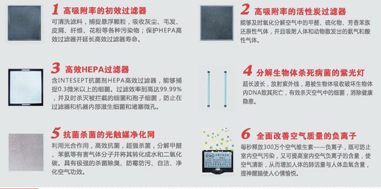 • 工作原理:活性炭 负离子 HEPA技术 紫外线 光触媒
