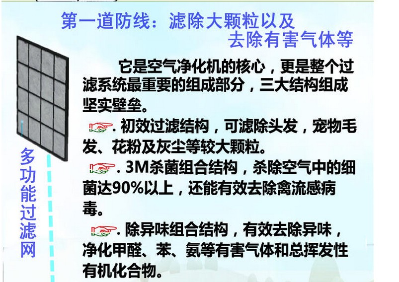 • 工作原理:HEPASilent专利技术 负离子 HEPA技术 紫外线 光触媒