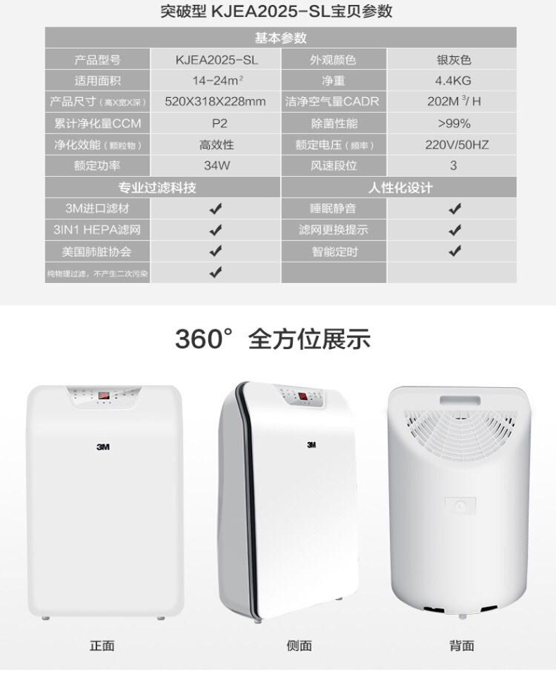 [华银环保生活馆空气净化,氧吧]现货3M空气净化器KJ2025-SL月销量3件仅售720元