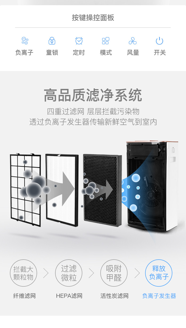 • 功能:除颗粒物 定时 除花粉 除VOC 除甲醛 除烟除尘 杀菌 加氧