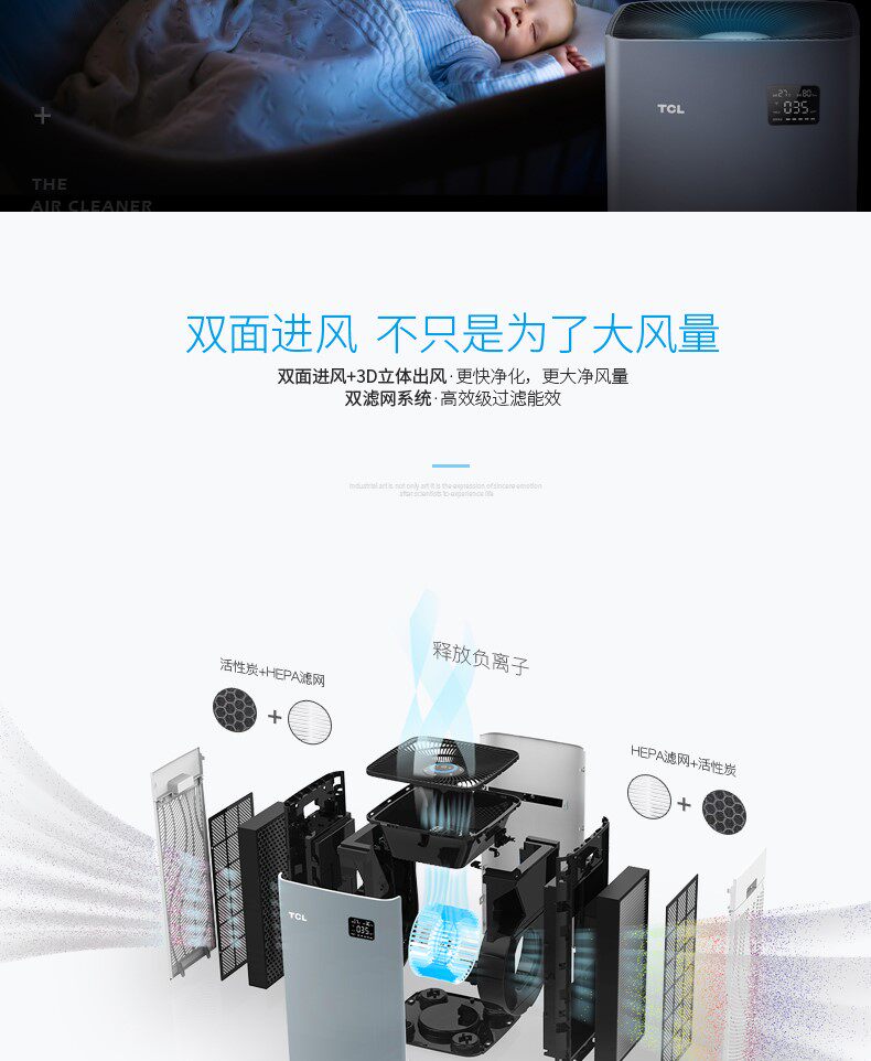 • 工作原理:活性炭 负离子 HEPA技术