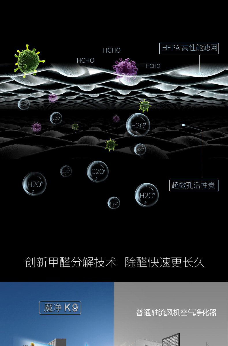 • 工作原理:活性炭 负离子 HEPA技术