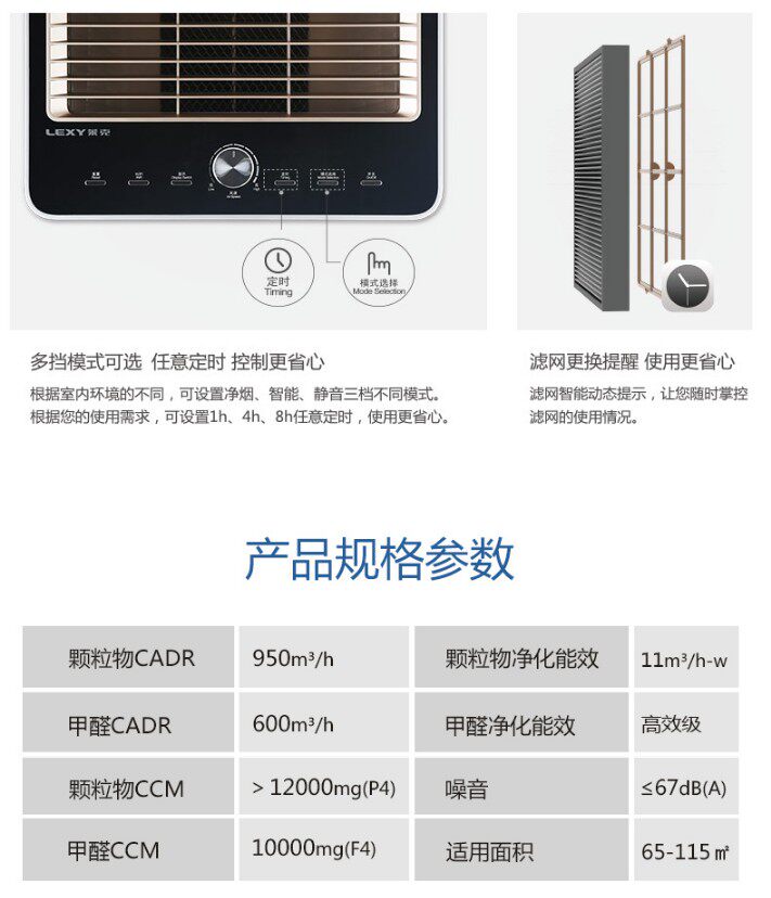 • 功能:定时 除VOC 除花粉 除颗粒物 除甲醛 除烟除尘