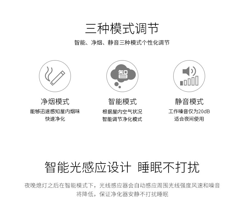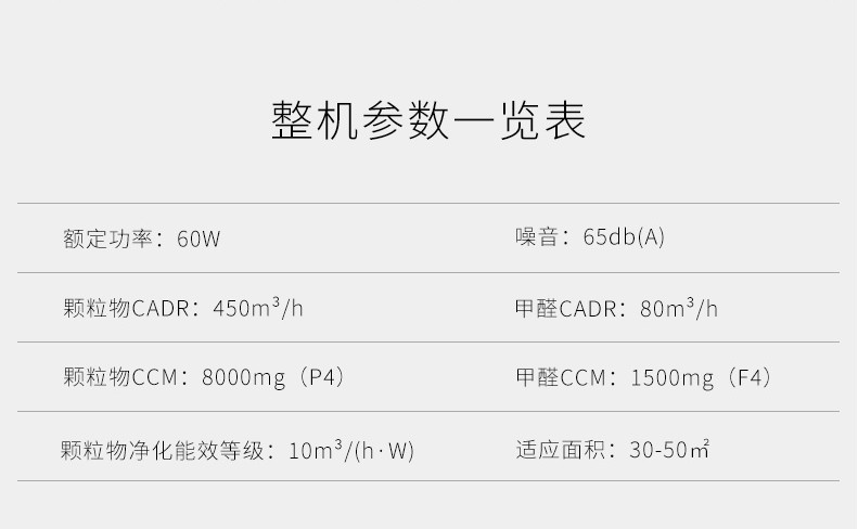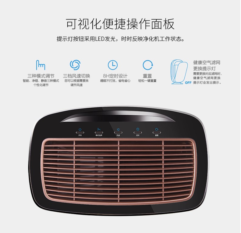 • 功能:定时 除VOC 除花粉 除颗粒物 除甲醛 除烟除尘