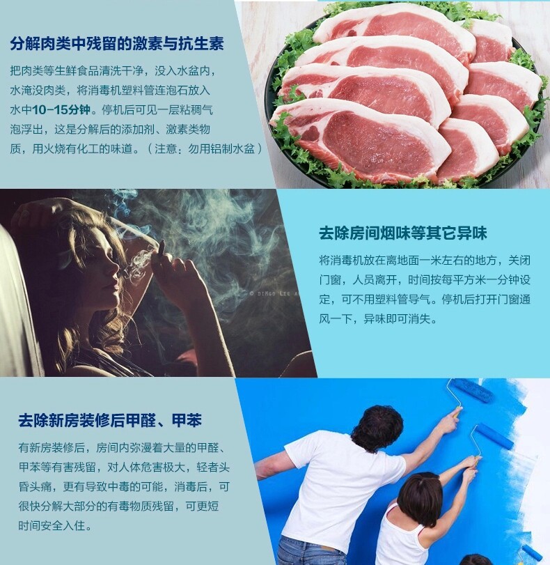 臭氧有草腥味,类似消毒水气味,用来给空气杀菌消毒的时候需要离开,使用后通风,过半小时左右没有臭氧味了在进入房间,如果洗菜消毒的时候可以给容器加层保鲜膜,减少臭氧进入空气,在通风的地方使用,也可以先离开,使用后在进入房间