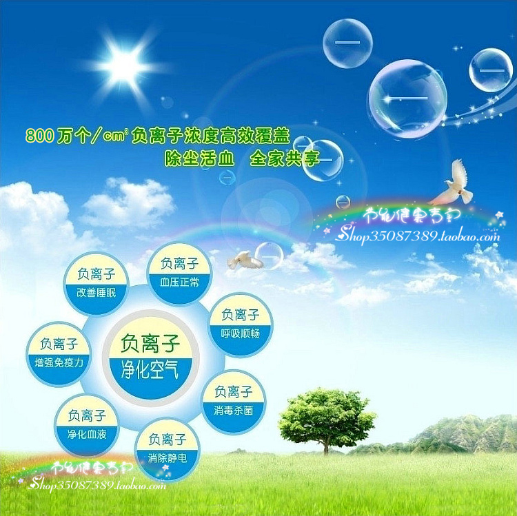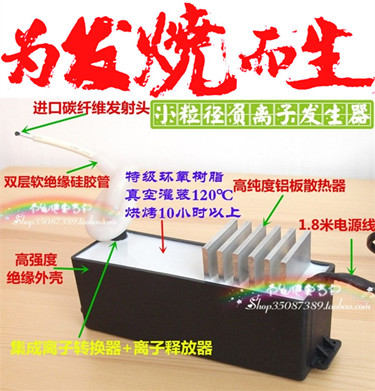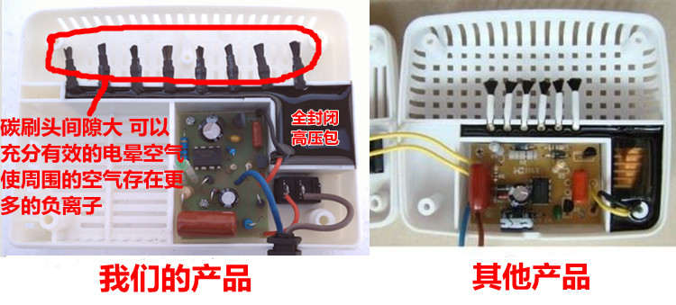 此款负离子设计非常精美!外观作了很大的改进把原先露在外面发射头全部放到内部(很多买家反应对孩子很不安全,而且容易损坏),背面有挂孔设计可以挂着也可以放着使用,而且电子线路做了改良,智能自动循环控制开关时间,自动工作30-40分钟停7-15分钟,可365天插电使用的负离子发生器.性能更稳定,寿命更长,发射头改为8头,使负离子量 更大 效果更明显!!!性价比更好!机内电子元件采取高低压分开电路设计,便于修理(以前产品采用环氧树脂全部封死,很不利修理和散热,所以以前产品返修率高,寿命短),按买家要求我们还设计了电源开关,虽然增加了成本但买家使用起来更方便.我们将有多种外壳颜色供你选择,做到更人性化.我们的宗旨是不求最好但求更好!为所有买家提供质优价低的好产品!拒绝暴利!带1.3米优质电源线 可以任意摆放 方便实用,负离子实际浓度高于800万-1500万个/立方厘米!本机利用脉冲、振荡电器将低电压升至直流负高压,利用碳毛刷尖端或针尖的尖端放电原理,将空气电离,从而产生负离子。通常多采用碳刷作为放电端,碳刷与针尖相比放电空间更大,效果更好,使用更安全!它的工作原理与大自然中"打雷闪电"时产生负离子的现象相一致。