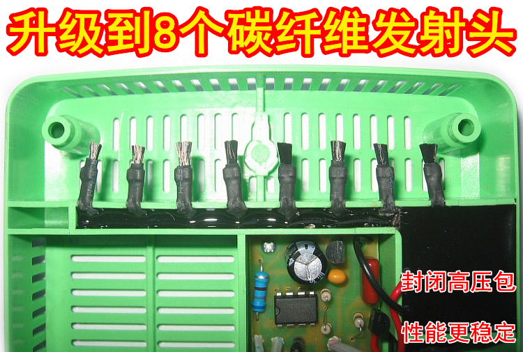 3:智能循环定时电路设计,工作30--40分钟,停机7--15分钟,确保本机能长年工作; 5:封闭式外壳设计,把高压电压端(发射头)置于百叶窗内,有效防止触电的危险; 6:输入电压:AC200V--240V/50-60Hz,并连有长度大于140厘米的电源线;标准两扁插插头;