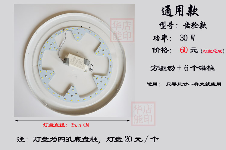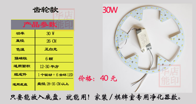 本产品自带强磁,能有效吸附在铁盘上,故可以改造很多市场上的不同款净化器,老的环形灯管的也可以,只要灯盘尺寸符合,能放入就可以使用!故亲买的时候可以不用考虑底盘,直接买LED灯片+驱动就可以,还省了20元/个。况且底盘不一定符全你的固定孔,买回去还的另外打孔。(下面的2款都带强磁 )