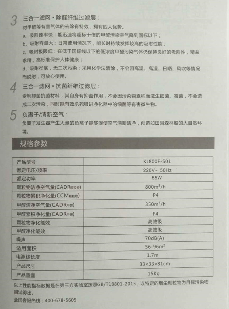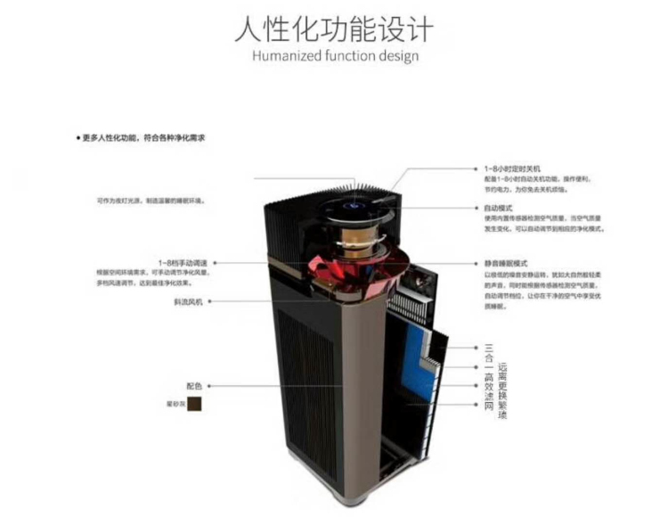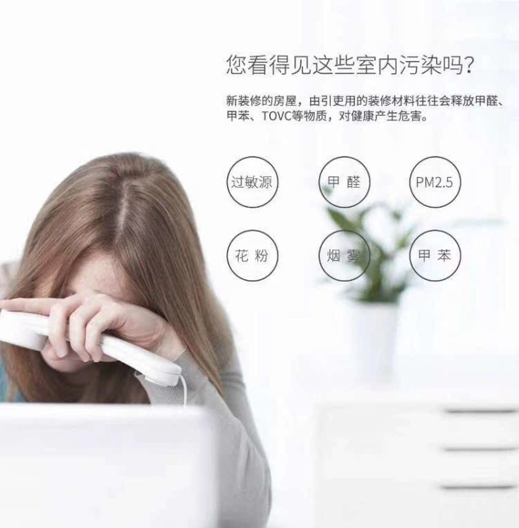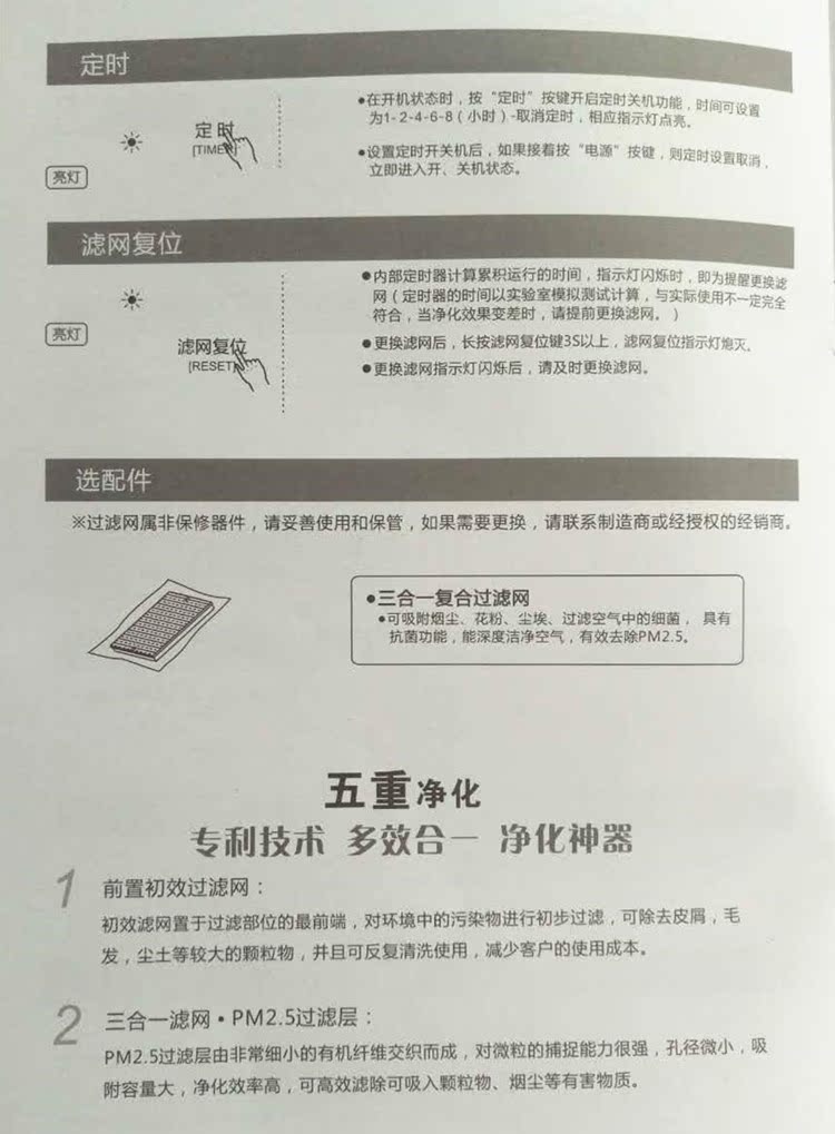 • 功能:定时 除VOC 除花粉 除颗粒物 除甲醛 除烟除尘 杀菌 除雾霾 除菌, 负离子 除菌