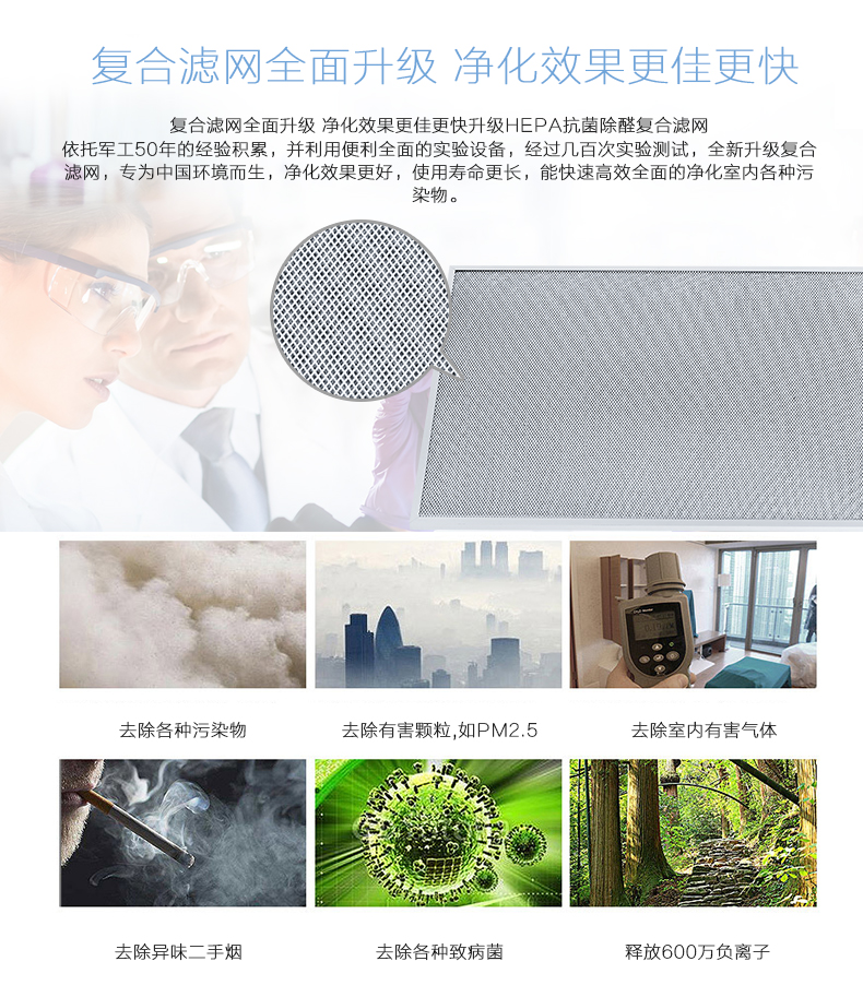• 工作原理:活性炭 负离子 等离子 HEPA技术 紫外线 光触媒
