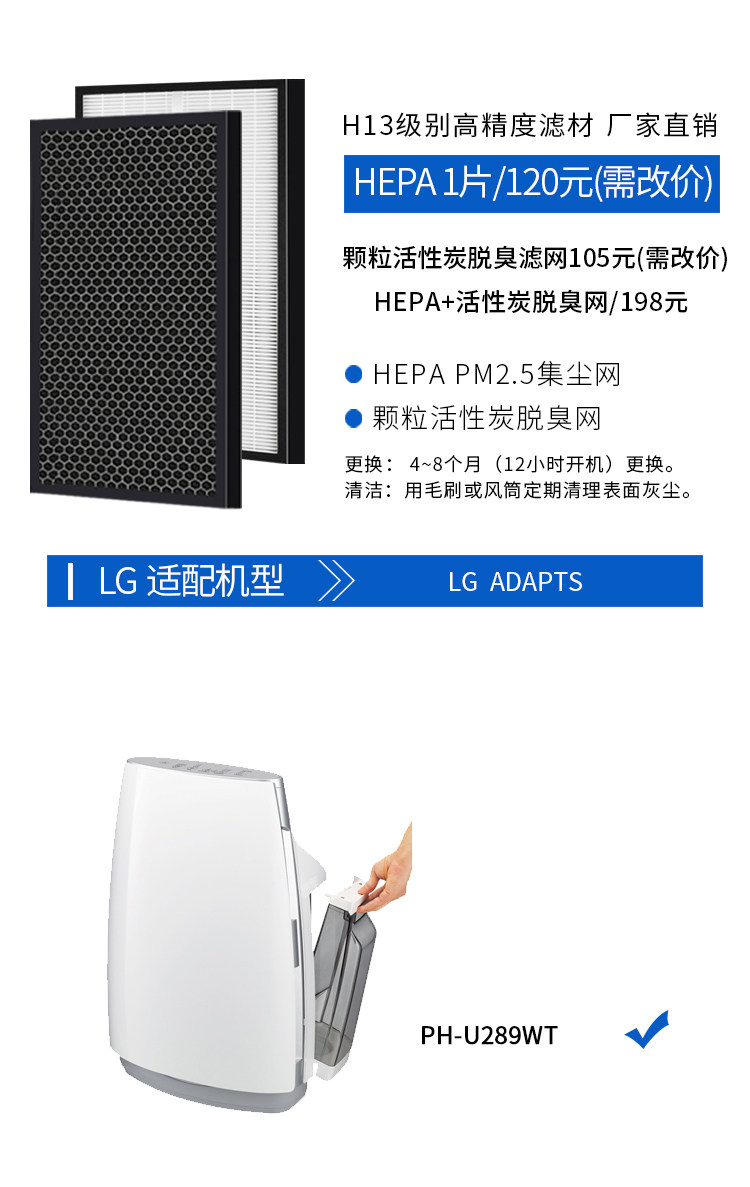适配LG 空气净化器PH-U289WT 高效HEPA 除甲醛 活性炭滤网