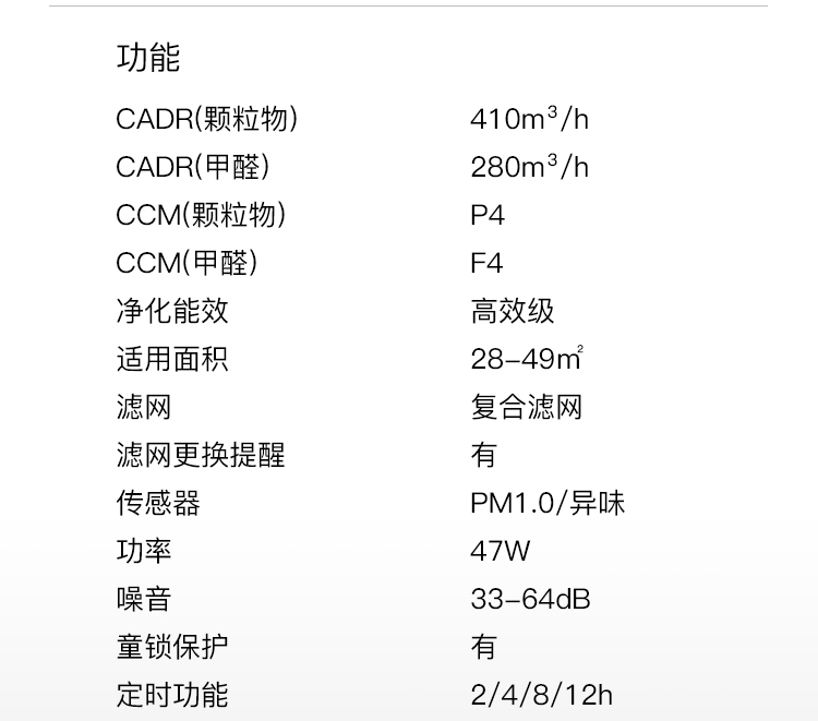 • 功能:定时除花粉除颗粒物除甲醛除雾霾