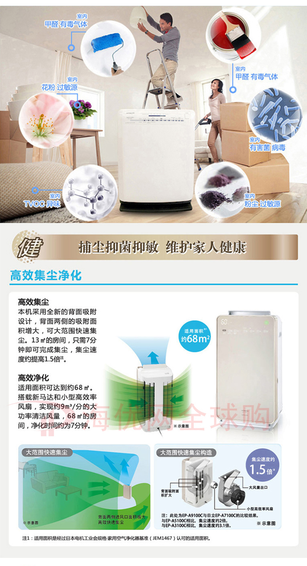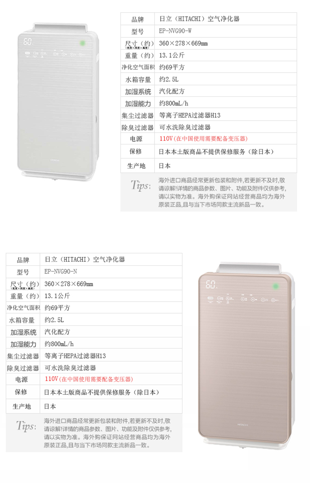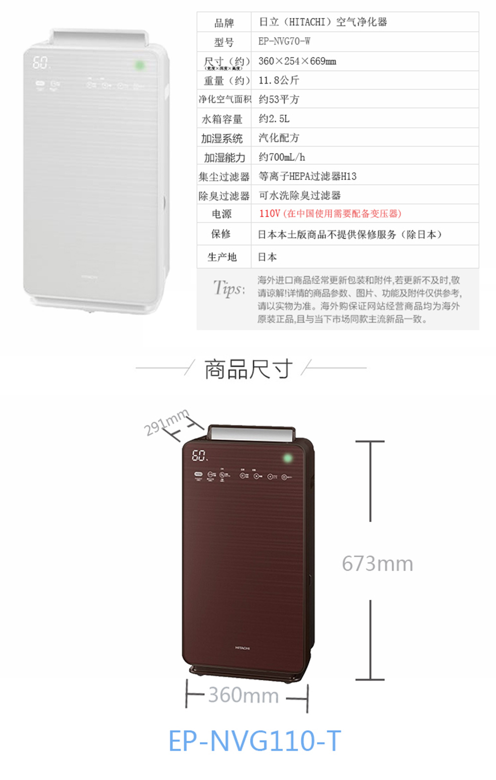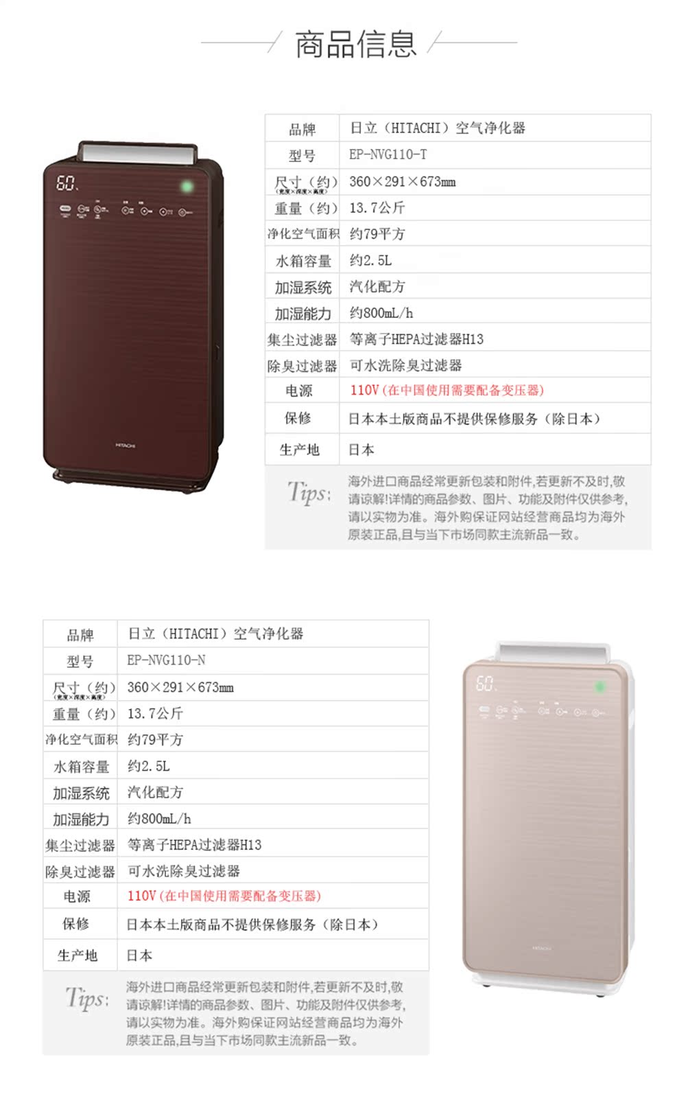 日本直邮 日本本土 EP-NVG110-T 日立加湿空气净化器自动睡眠