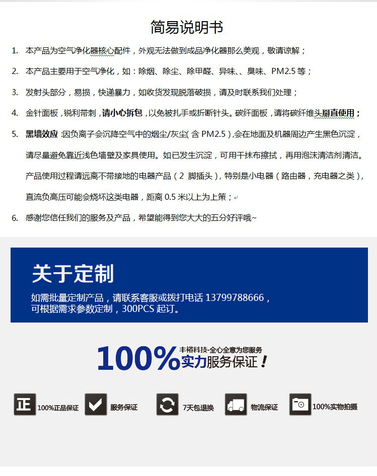 5. 本款产品针对汽车使用做了相应的优化处理,无常规负离子产品的”直流负高压回流”,不会烧汽车点烟器插头,其他负离子产品如无屏蔽,单独使用,会有风险。当然如果参数低的,也不会有风险,但是效果会很差。