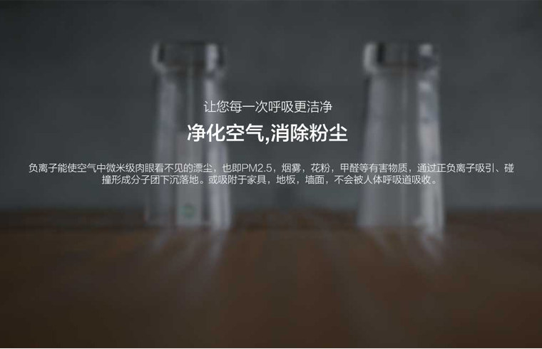 通过持续不断产生高浓度负离子,能使空气中肉眼看不见的漂尘(PM2.5)、烟雾、花粉、甲醛等有害物质,通过正负离子吸引,碰撞形成分子团下沉落地,达到净化作用。