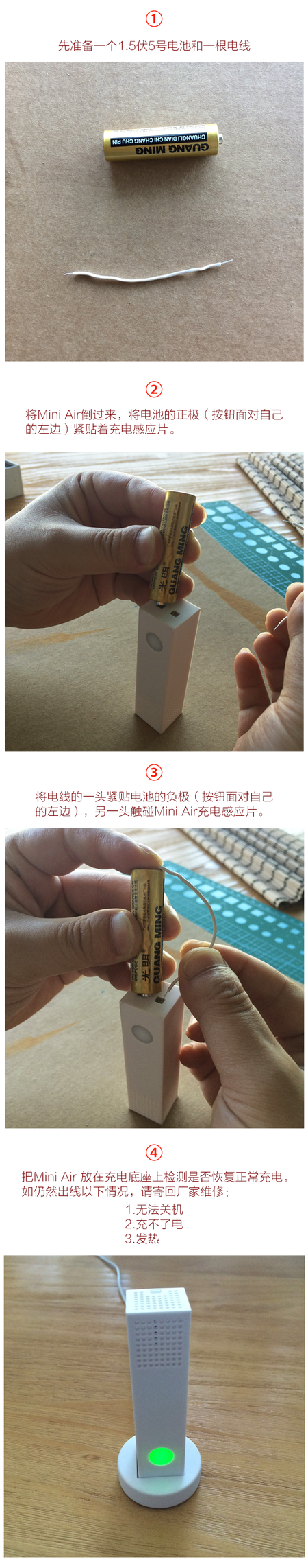 如果Mini Air有电并且未充电时,每隔5-7秒会有呼吸灯闪现一次,此时表示Mini Air已处于工作状态。