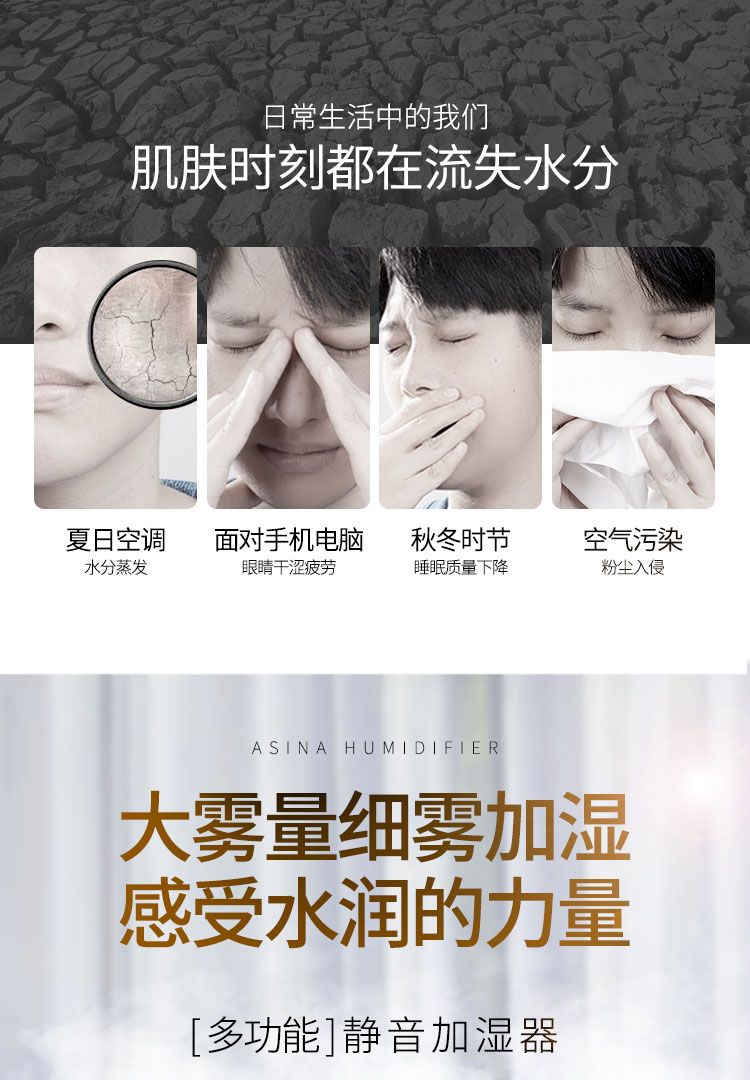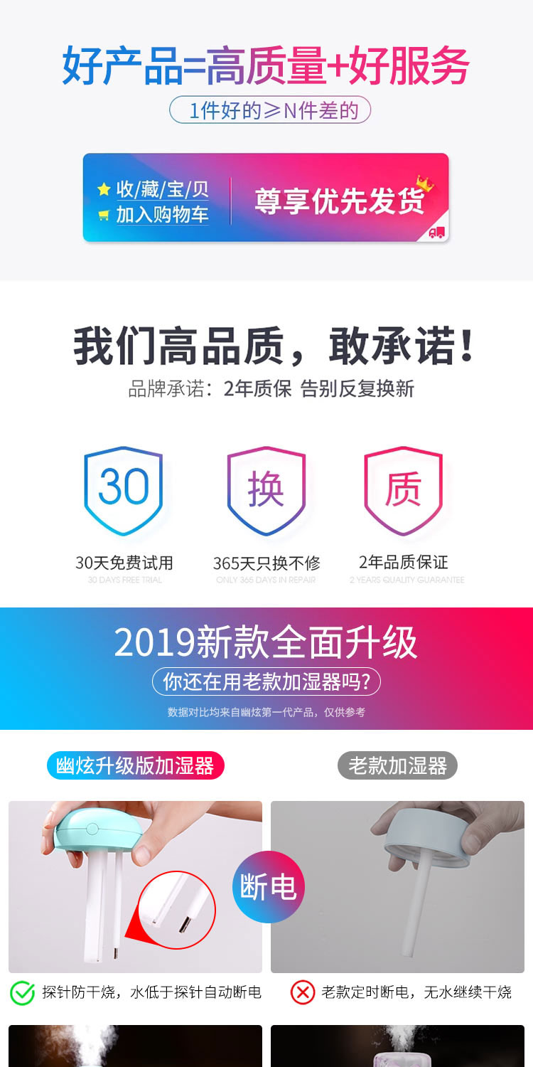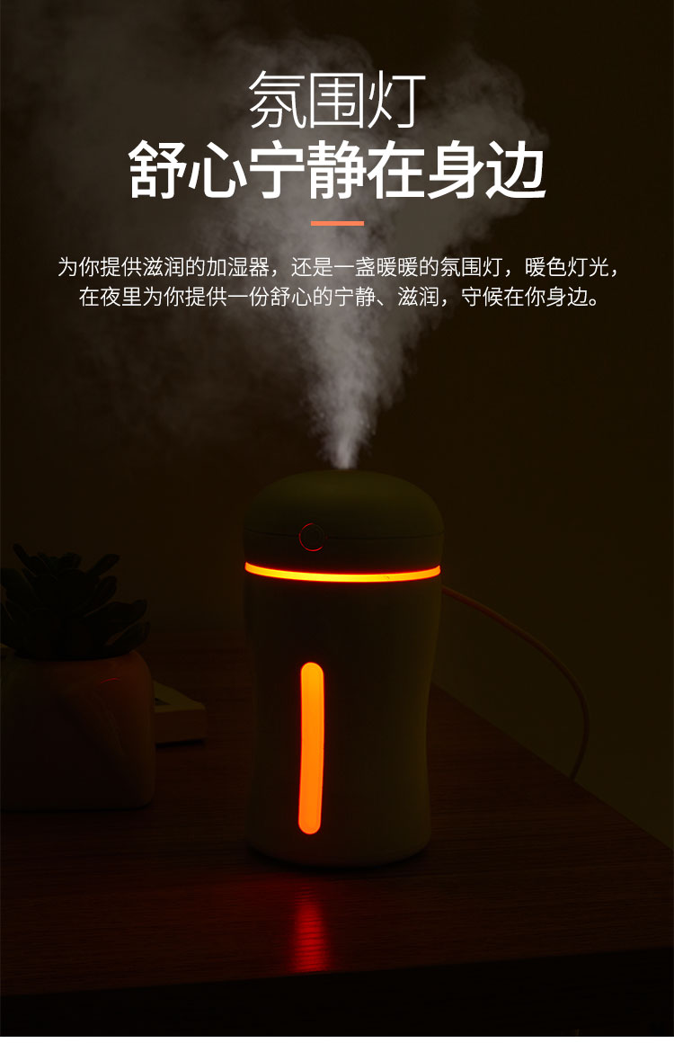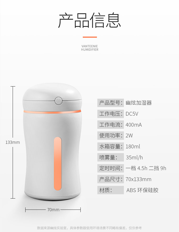 宝贝收到了,棒棒哒~真的不错,很小巧玲珑而且精致,外观漂亮可爱,白色好漂亮,比想象中好,真喜欢。插上usb一按开关就开始喷雾出来了,雾很大。下面的灯还会一直变化不同颜色的,好可爱。而且声音不大,基本上是听不到的。开着空调空气湿润了也清新多了。有需要下次还来你家店光顾