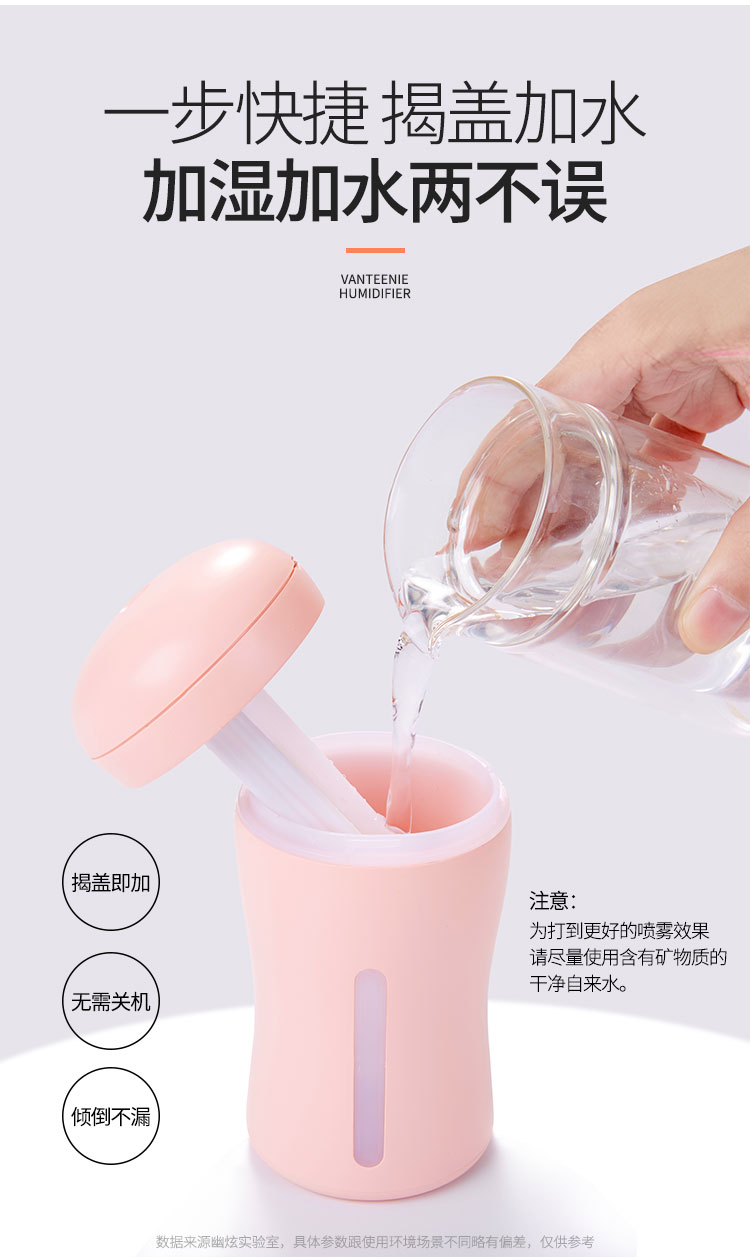 这个加湿器的质量很好的呢,收到货之后就立马插上电就开始用了,感觉很不错哦,第一次使用都是没有异味的呢,喷雾也是很细腻、很大,加自来水就可以。加湿效果也还不错呢,使用了几天之后就明显的感觉到第二天起床皮肤都没有那么的干燥啦。灯有很多色,实物很是萌萌哒,很满意的一次网购。