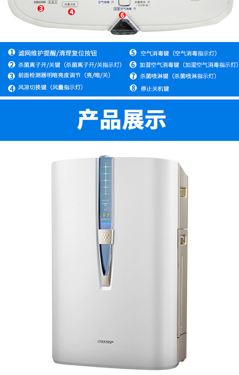 • 功能:除花粉 除颗粒物 除甲醛 除烟除尘 杀菌 加湿 除雾霾 除菌, 负离子 除菌