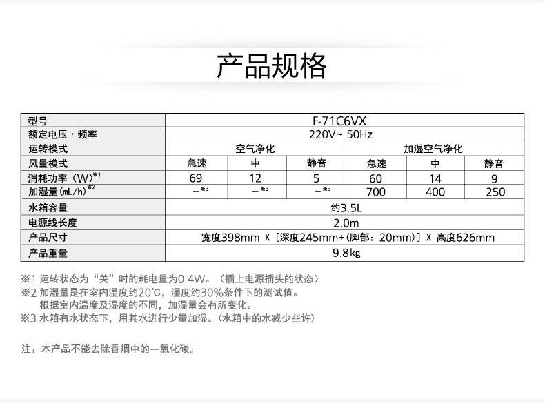 松下空气净化器家用卧室加湿静音除甲醛烟味PM2.5雾霾 F-71C6VX