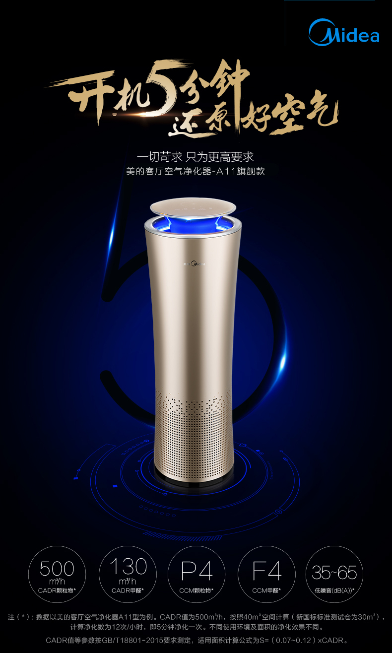 【自营】Midea/美的 家用除甲醛除烟尘杀菌空气净化器KJ500G-A11