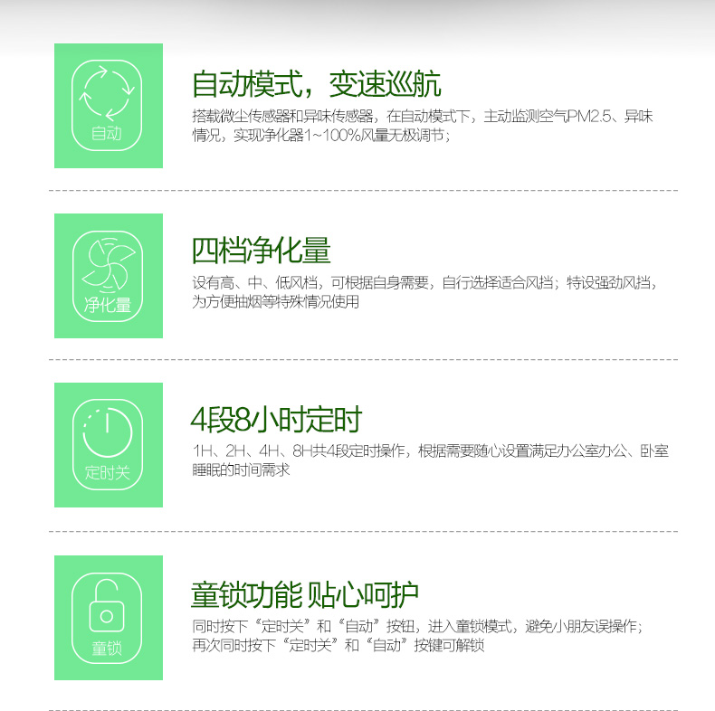 • 功能:定时除花粉除甲醛除烟除尘杀菌