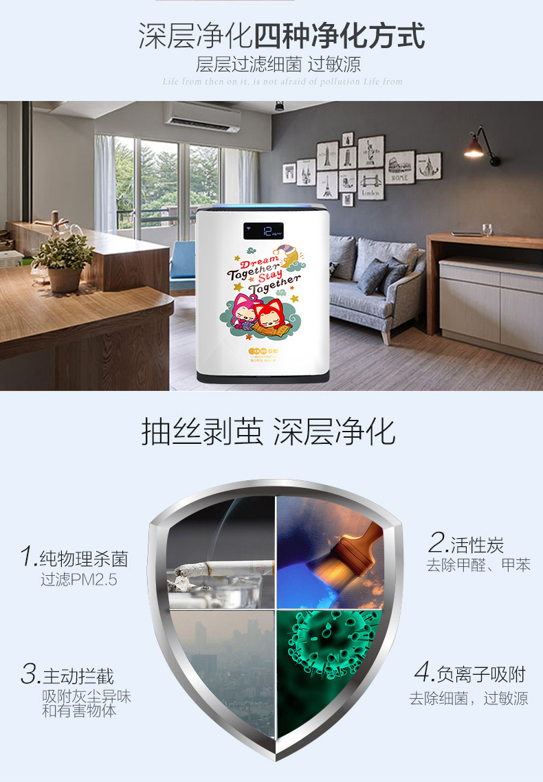 • 工作原理:活性炭 负离子 HEPA技术 臭氧