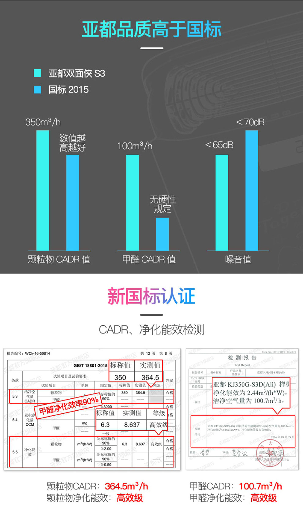 • 甲醛CADR值:100立方米/小时