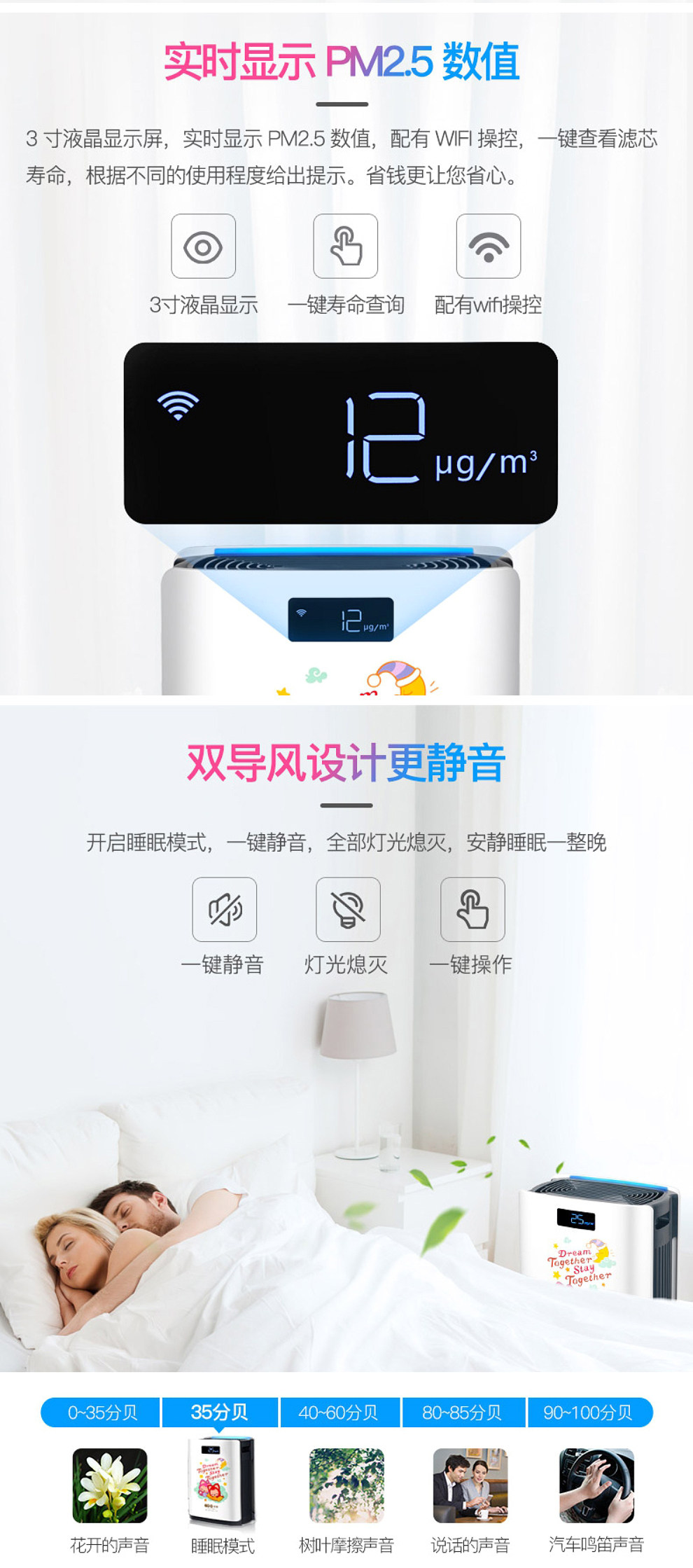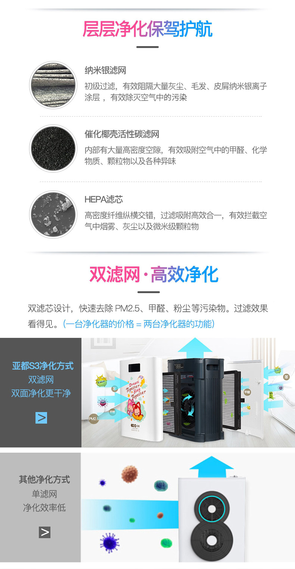 • 功能:除花粉 除颗粒物 除甲醛 除烟除尘 杀菌