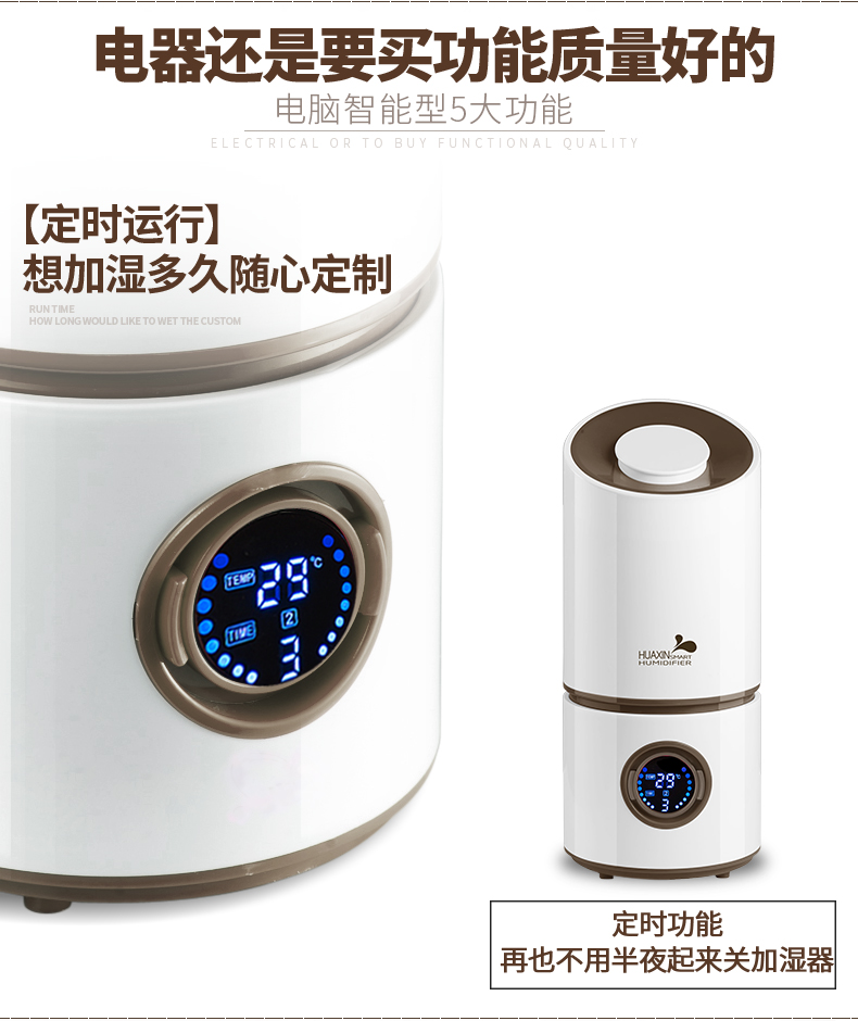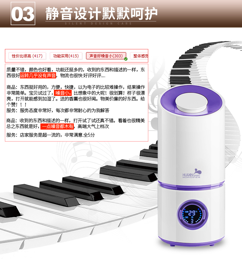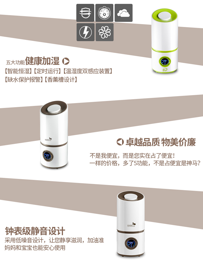 老人家里空气干,想买个加湿器,挑来挑去还是买了这件,外观真的漂亮,也很安静,性价比很高,值得购买?( 'ω' )?外观材质:性价比高,卖家发货及时,物流快,包装完好,收货后打开试了试,使用正常,噪音不大,好评!宝贝很好我刚起来真的顺风顺水如同滔滔江水奔流不息值得拥有加湿器收到了,实物很漂亮,水箱很大,3 档出来的水雾也很大,噪声小,客服人员好,好评!加湿效果不错,雾量大,性价比高,不错的一款产品,是我要的效果在京城这样雾霾严重的城市,空气不清新。买个这个加湿器效果还是不错的,感觉空气很清爽,还能调节大小个定时很不错L4.3