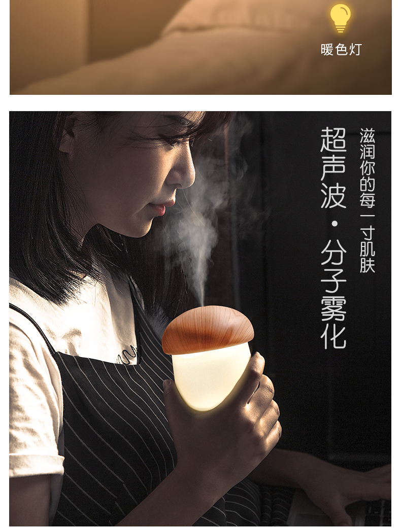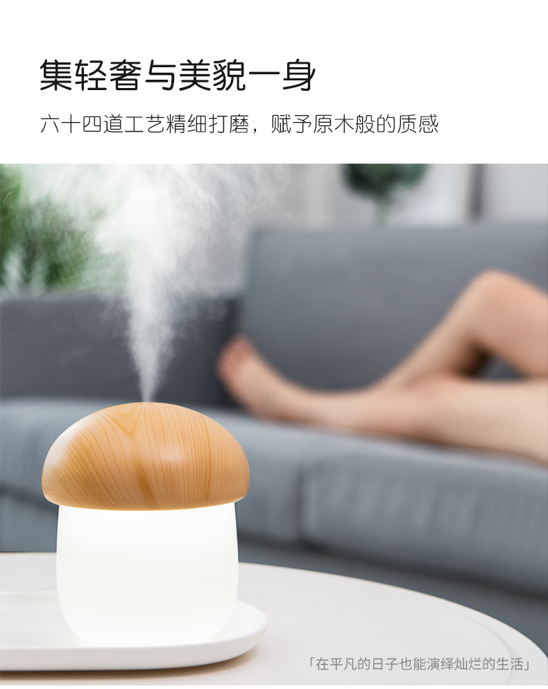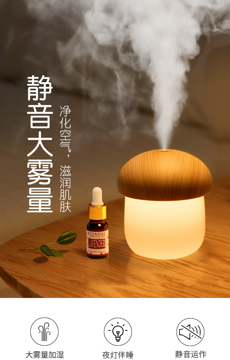 很棒的喷雾器,雾量很大,声音一点都不吵。蘑菇外形也很可爱,用来作夜灯非常漂亮,光线很柔和。刚开始使用时,没有浸泡棉滤芯,所以不喷雾,在客服耐心的帮助下,立刻上手