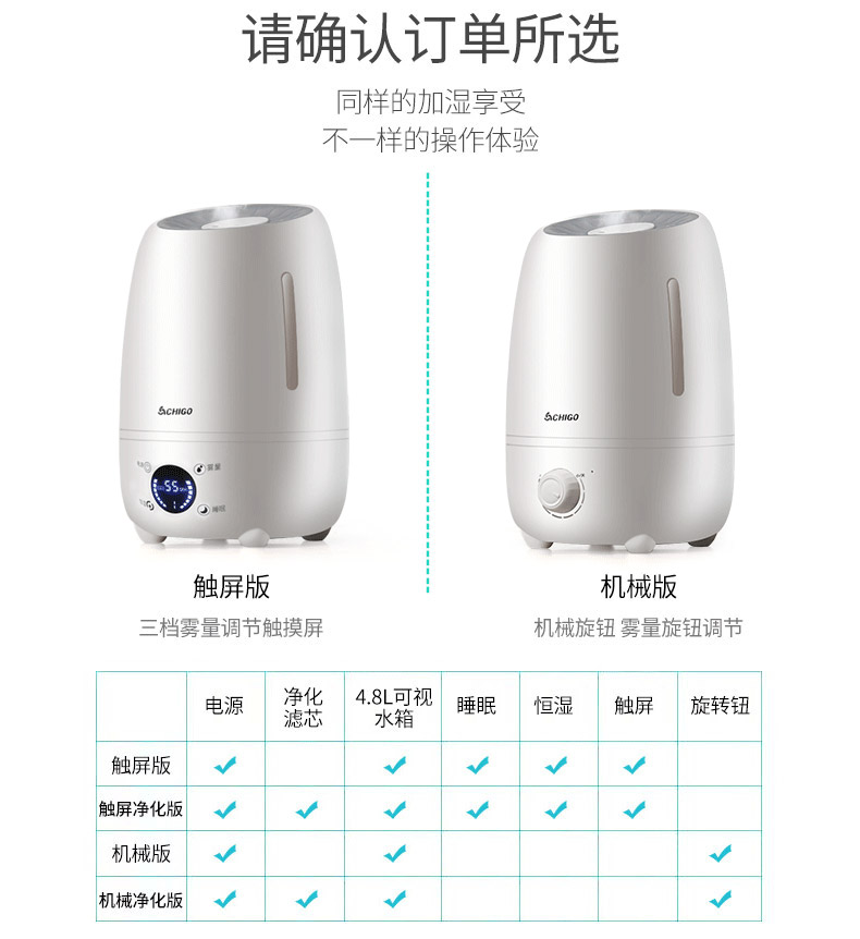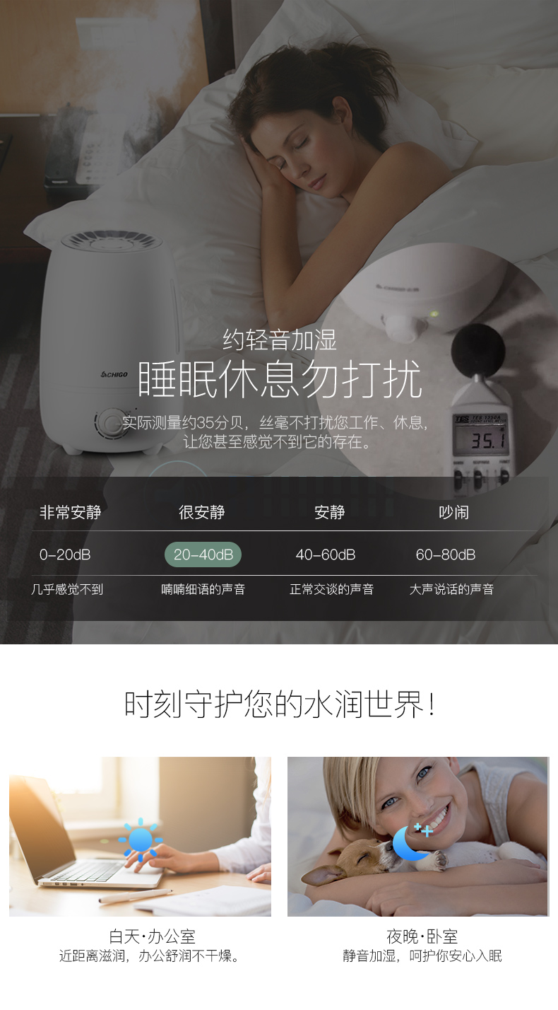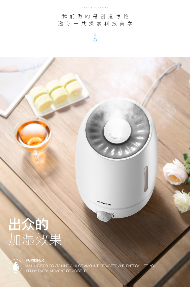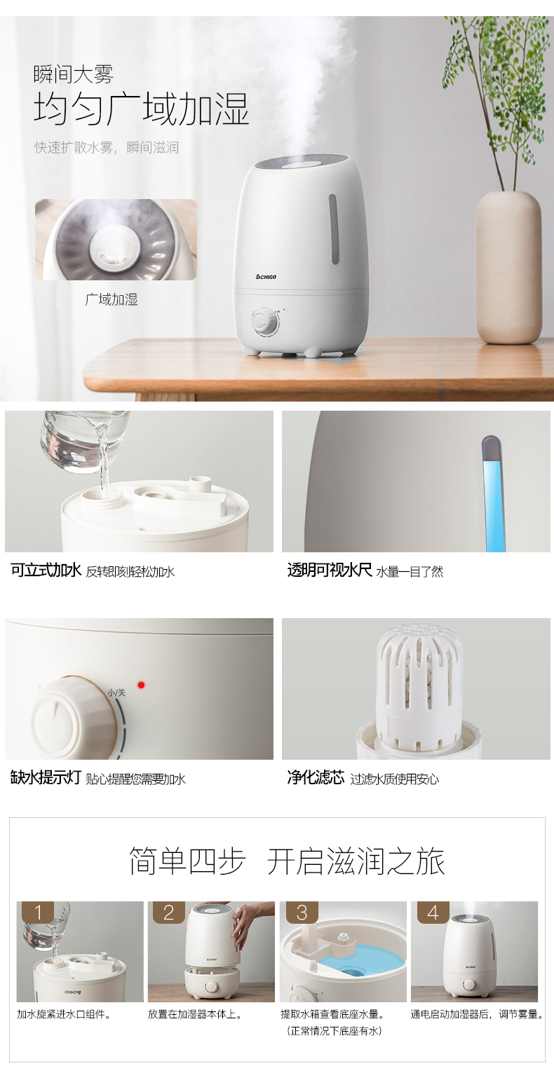 加湿效果:效果非常好,非常满意, 水箱容量:水箱容量比较大 ,几乎没有噪音,外观好看 样子可爱,关键是使用方便。
