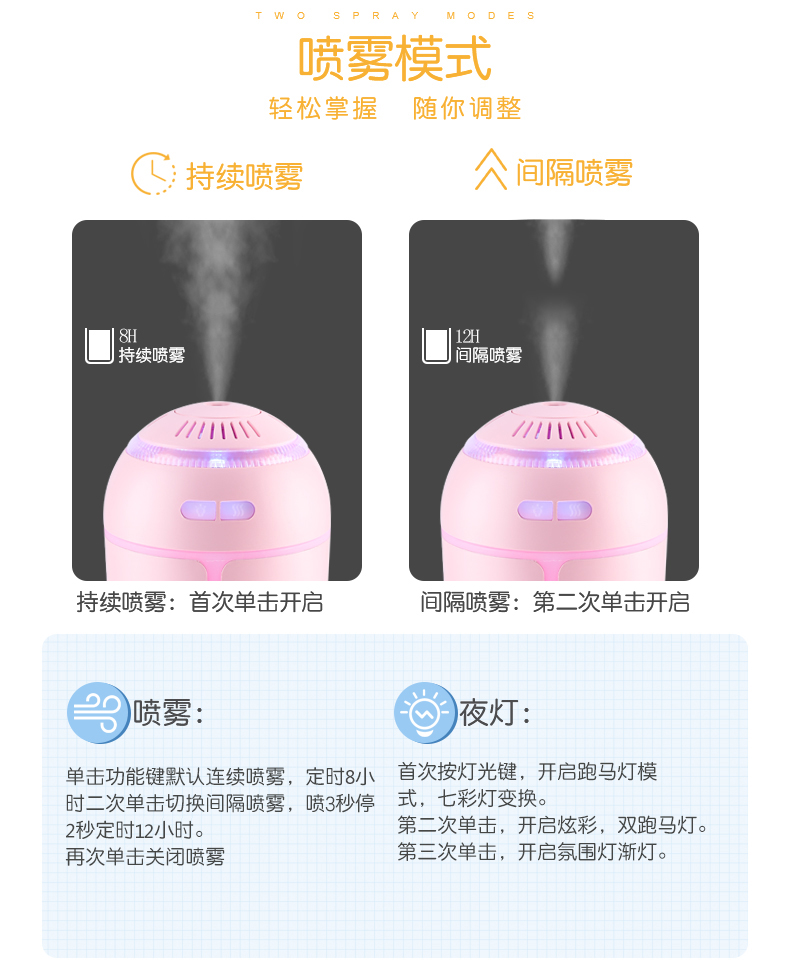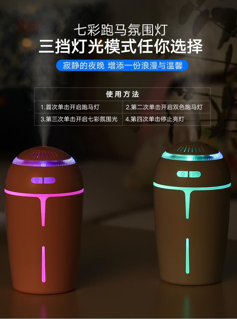 没事在家里的时候,一边看电视,一边吃着零食,冬季干燥的天气再开着加湿器,确实很不错呢,享受下周末的愉快时光,加湿器挺好的,放在我房间正好呢,没事的时候用用改善下空气的质量,冬季干燥的天气,真的很难受,有这个滋润下工作的枯燥无味,多点生活的五彩缤纷,宝贝质量很好,灯光很漂亮,也不会 漏水,放在车里家里都可以,都很好用,很不错的购物哦。