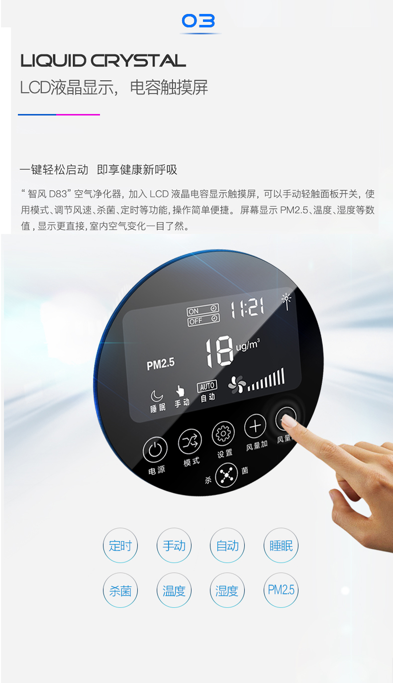 • 功能:定时 除VOC 除花粉 除颗粒物 除甲醛 除烟除尘 杀菌 除雾霾 除菌, 负离子 除菌
