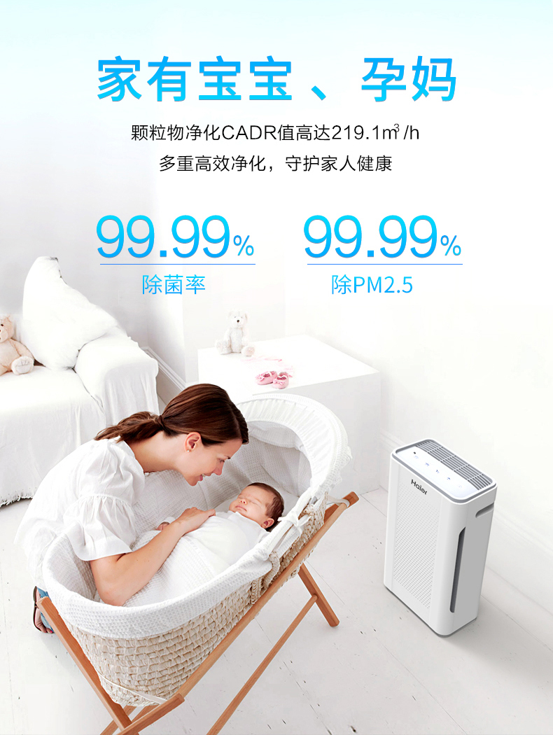 海尔空气净化器太棒了!大品牌质量就是有保证的,自己再配上空气实时监测器更完美!这款清洁空气效果很好,声音不大,睡眠模式声音比空调还小,不影响睡眠,净化空气的能力挺强,提前开好,房间几乎闻不到异味,感觉不错啦,很好很好的产品,颜值很高,相信海尔的品质!