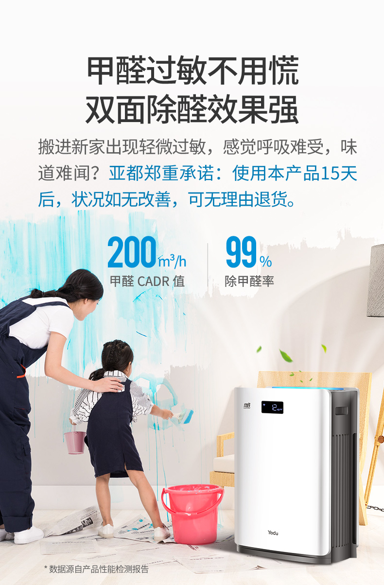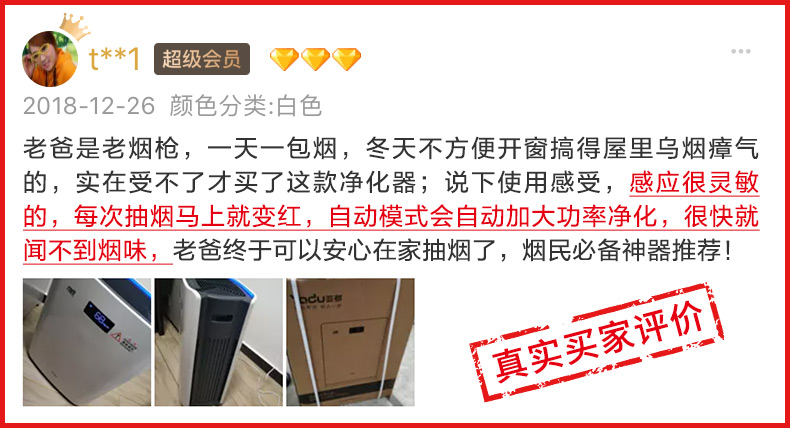 净化器收到用了几天才来评价的,因孩子对烟雾尘螨过敏,家里人虽在阳台抽烟,但烟雾仍会飘到里屋,害得孩子咳嗽喷涕连天!!!看医生,医生讲要避开烟雾。想着07年曾买过的亚都空气净化器,赶紧上网查找,现在的比老款先进多了,不用每天加水。净化功能目前来讲,很了错!家人在阳台抽烟,孩子在书房开着净化器,再没有过敏反应。全五星好评!