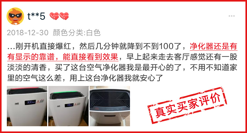 宝贝收到了,虽说比想象中大了不少。但还是比较满意的,因为拿它试了一下,不试不知道,尽管室外空气质量为良,但室内还是有160多呢,宝贝运行几分钟就降为40多了。运行还不错!