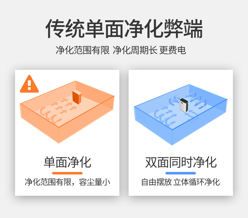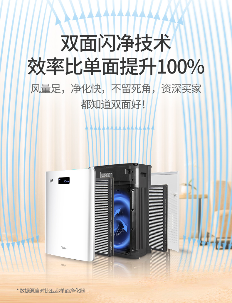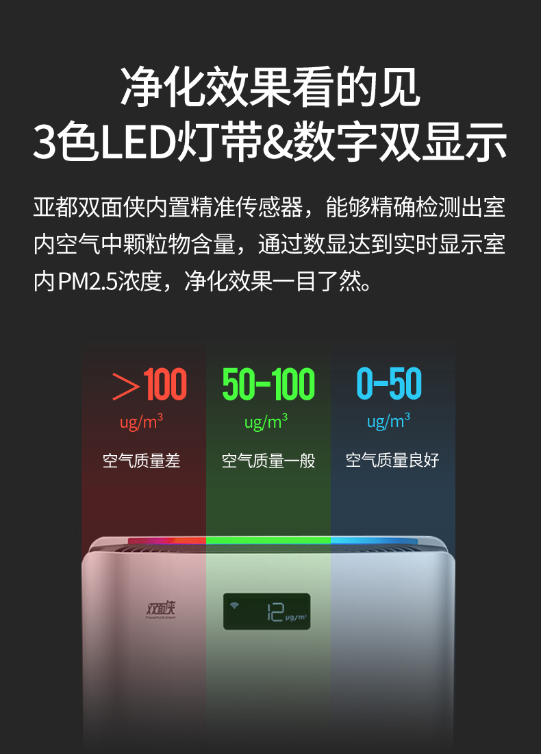 机械和电气系统运转正常,可能是室内空气中灰尘少,一直是兰灯(数字指示值也很低),无法感知其它的净化空气效果。